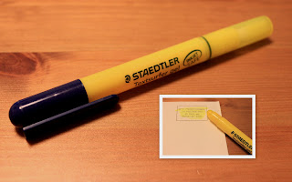 這隻筆是crayon式的螢光筆,筆頭跟蠟筆的頭很像,筆頭會愈用愈短,這時候旋轉筆蓋的那一端,新的一節就會被轉出來,跟口紅膠一樣。這麼新奇的東西當然要買回來用用看。¥157。