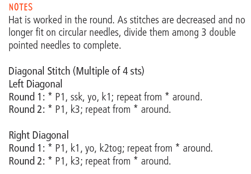 第二round織法:換成大一點的輪針(也就是5mm的輪針),開始織向左斜的蕾絲織法,直到織品4吋長。第二圈圖案最後要用round 2的織法(也就是p1, k3)結束。