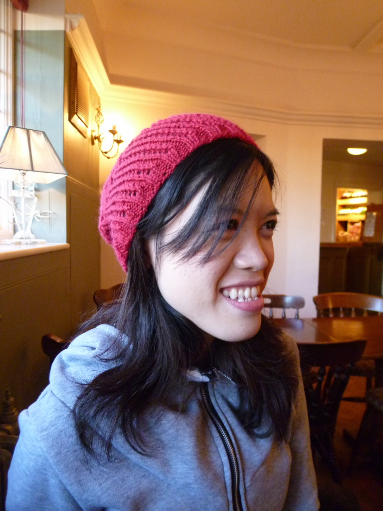 最近讓我廢寢忘食的就是這頂all day beret貝雷帽了。首先是這個帽子的顏色很吸引我(根本是模特兒太美了吧),這個叫做lipstick口紅色的帽子配上薄薄的毛衣走在路上光是想像就很吸引人,所以我也不管現在這種快要0度的天氣戴這種有很多洞洞的帽子一點也不會保暖,而且冷到每天把自己穿得跟熊一樣,薄毛衣只能用想像的,反正我就是要先為自己織一頂就對了。