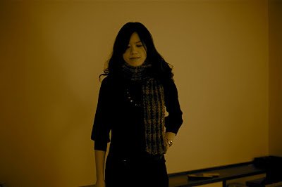 我們再次請我們不具名的模特兒幫我們示範這條圍巾的穿搭:紫灰色圍巾+黑色上衣 ♥