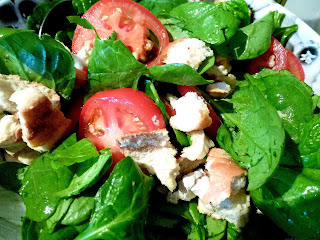 5. 生菜沙拉----這其實是看美食節目得到的靈感,剛好下午的電視節目在教如何利用擺了好幾天硬掉的麵包,其中一招就是把硬掉的麵包剝成一小塊一小塊,撒上鹽、黑胡椒和橄欖油,用180度烤個10分鐘。同時把綜合生菜、番茄、紅洋蔥放在碗裡,加上鹽、黑胡椒、橄欖油和醋調好的醬汁,然後再把烤好的麵包拌入,就是超簡單的生菜沙拉了。