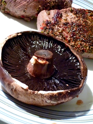 6. portobello mushroom----這又是個新發現,英國的菇類超多的,中文叫什麼我也不知道,總之因為在朋友家發現這個portobello mushroom成為牛排旁邊的配菜,一大朵的菇放在盤子上就佔了四分之一的面積,汁又多又鮮,大大方方不是一般菇類可以相比的,所以就成為今天的新嘗試了。做法仍然一樣是加上鹽、黑胡椒並淋上一點橄欖油後煎/烤直到整個軟化為止(怎麼西式的做法老是不出這幾種調味料的範圍?!)。上網搜尋了一下,其實portobello mushroom的吃法很多,可以在上面蓋上cheese夾上肉排取代漢堡排的麵包外皮,也可以切細作成沙拉,下次再來玩玩別的吃法。