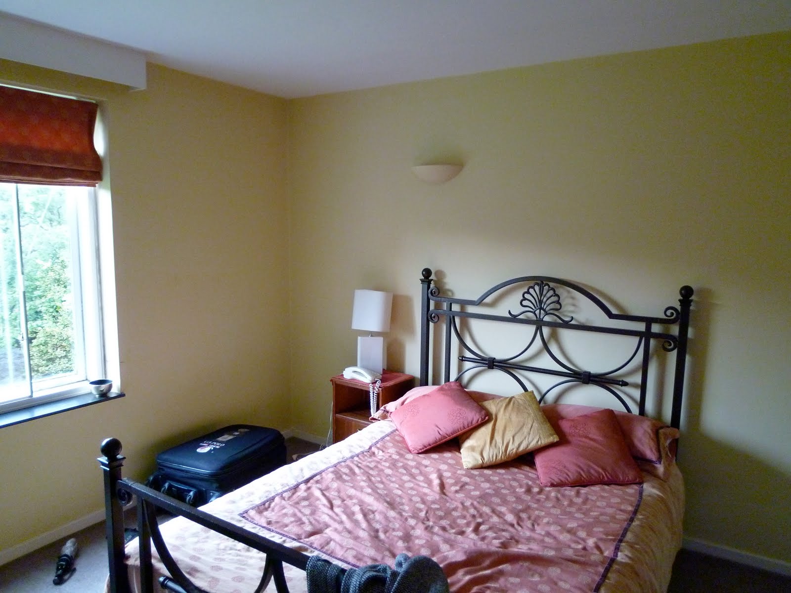 這是主臥房。不過當然後來買了新床單枕套。窗外就是草坪。