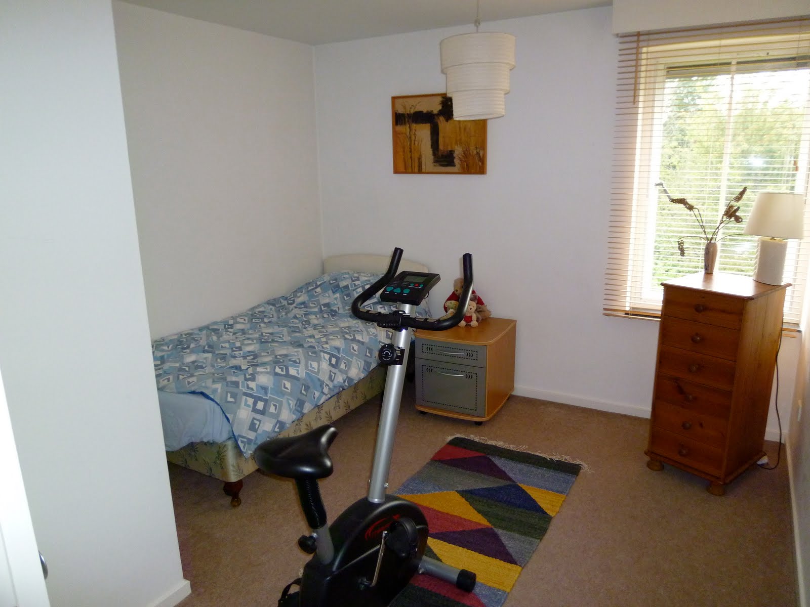 首先一進門就是客房。客房!不過當然後來因為發現我花太多時間在看電視上,而且還會邊看電視邊不斷把冰箱裡的東西搬出來吃,為了減少罪惡感所以把房間裡的健身腳踏車搬到客廳(因為交通太不方便天氣又冷,我決定足不出戶過宅女的生活)。