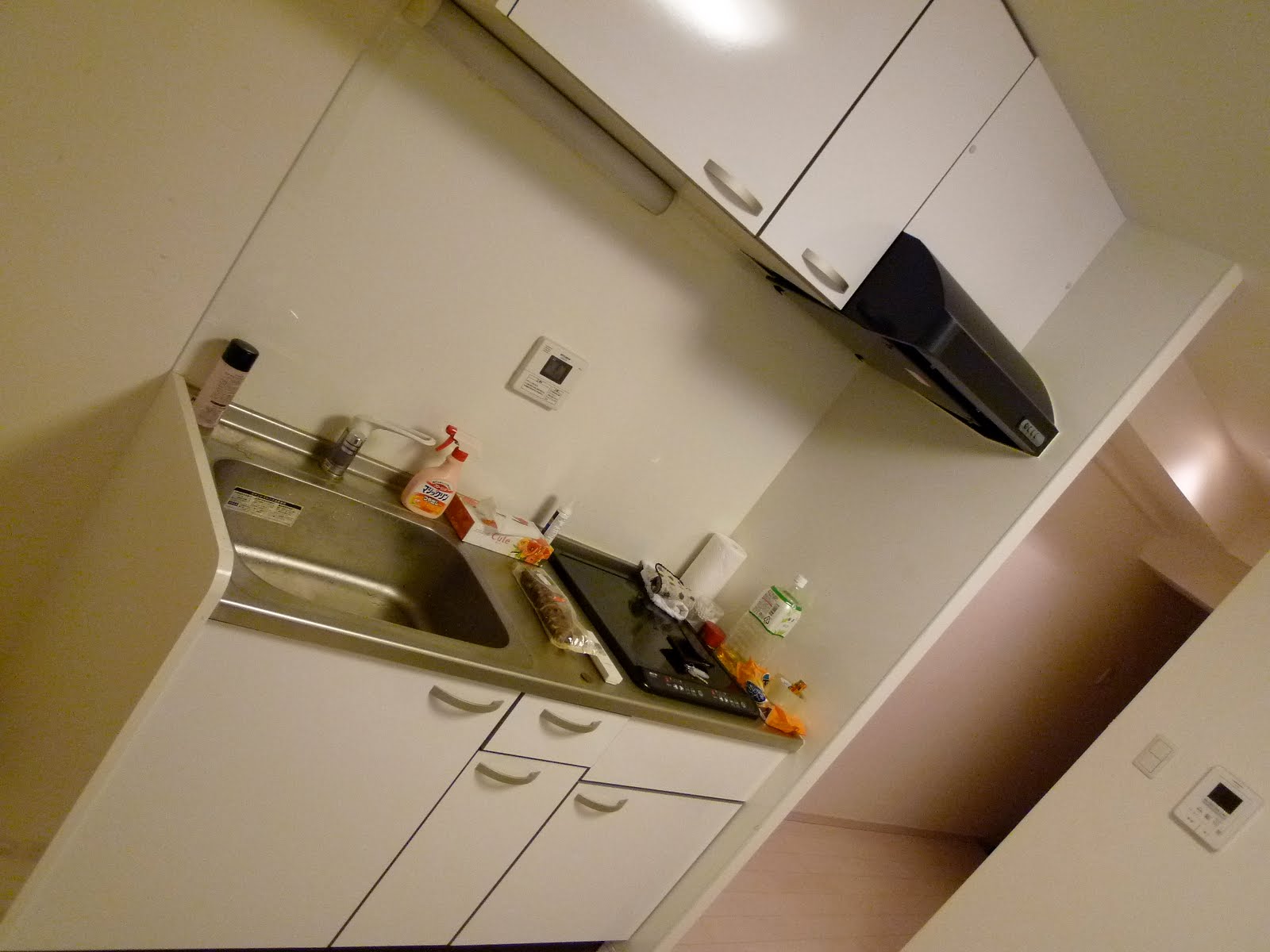 拿張東京公寓裡的廚房照片來比較一下。這張照片是最後整個東京的家裡面的傢具都賣掉後拍的,所以所有沒處放的東西通通被我們放到瓦斯爐上。整個廚房就是照片上看到的大小,瓦斯爐只有兩個。我們當初就在廚房旁放了張沙發,所以其實這個area應該是廚房/客廳共用。所以現在的廚房真的比以前的廚房膨脹了不少。