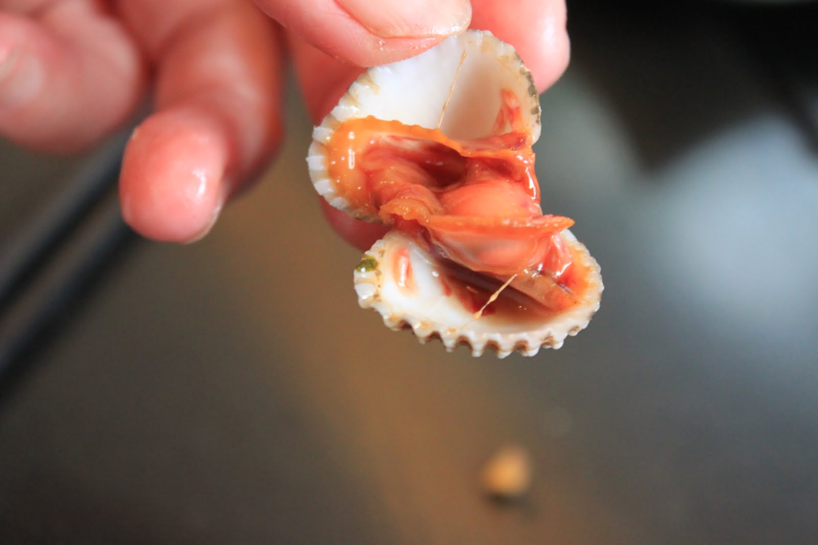 血蚶----肉呈橘紅色,多血,燙得過熟或不夠熟都會影響品質,為常見的下酒菜。