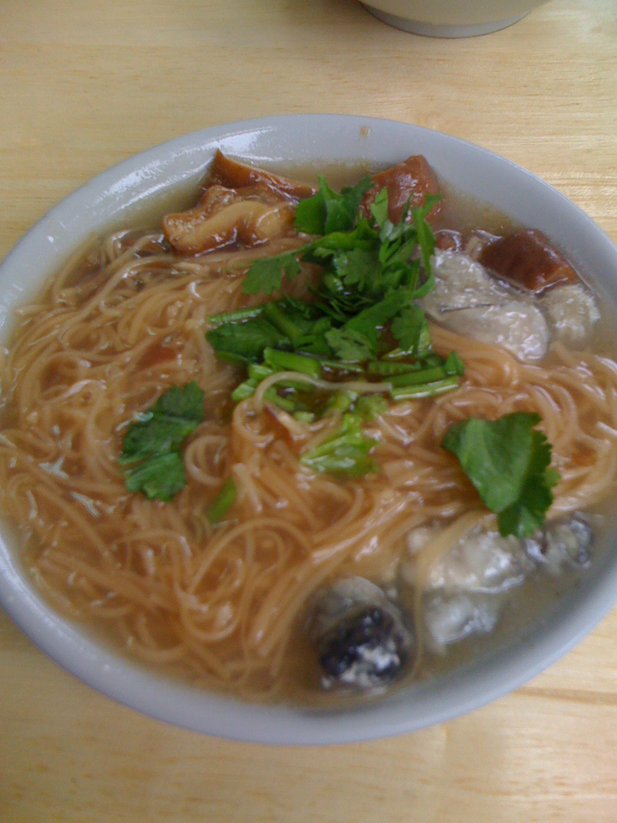 (お母さんおすすめの万華陳記の腸蚵麺線は、おいしかった。腸蚵麺線って、牡蠣と豚の大腸が入っているの麺だ。)