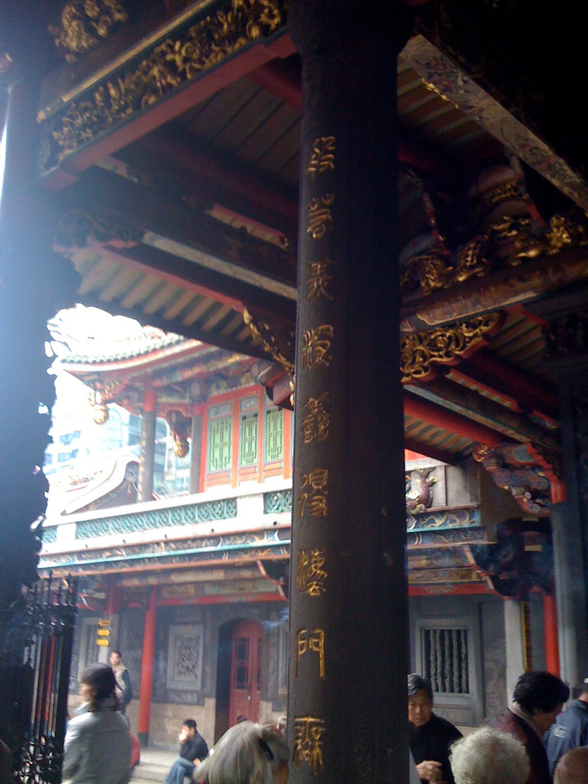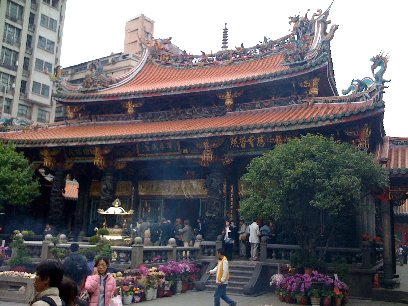 龍山寺是1738年的建築,之後經過多次改建和修復,現在是國家二級古蹟。龍山寺沒有俗麗的顏色,又蓋得很精緻,加上附近有名的華西街夜市,難怪成為觀光勝地。下次推薦外國人來台北,除了中正紀念堂、兩廳院、故宮以外,還會再多推薦他們來龍山寺吧。事實上,我們光是在龍山寺短暫的期間,就看到三隊日本的旅行團。