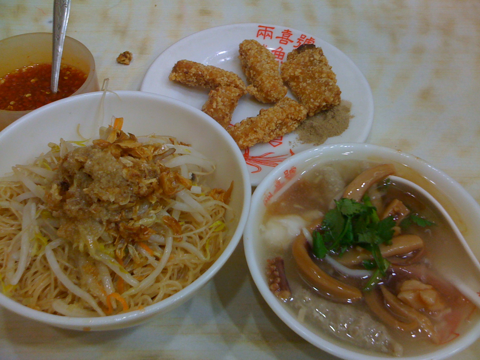 (兩喜號のビーフン炒め(材料は米だ)、唐揚げのツート魚、イカのとろみスープだ。これと前に書いたの腸蚵麺線は全部台湾の郷土料理だ。