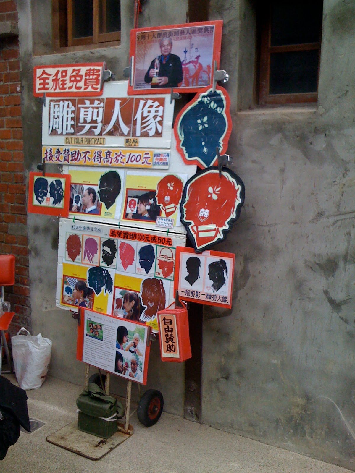 雕剪人像的攤販。小時候大概是在西門町吧,我和哥哥也剪過側面的剪影,可惜經過這麼多年,當年的剪影早就在混亂中不知去向。現在再也看不到這種雕剪人像的攤販了。