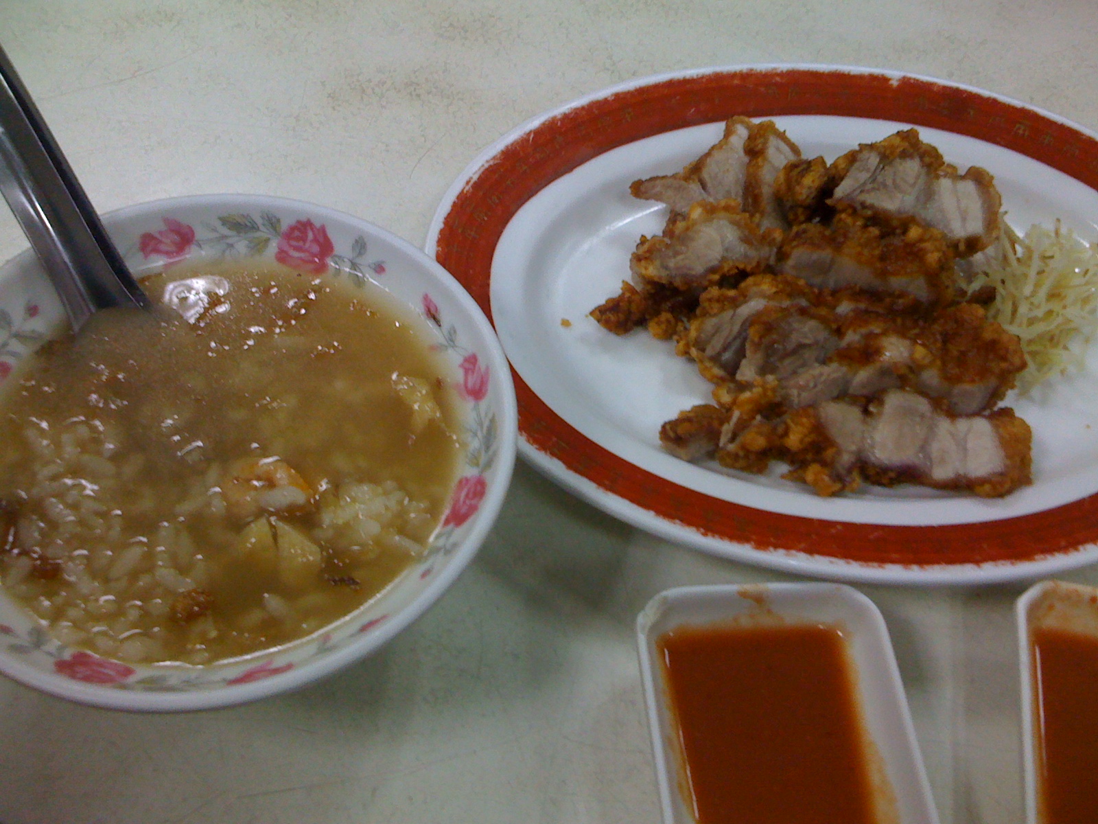 (そのあと、周記肉粥店に行った、紅焼肉とお粥を注文した。紅焼肉って、豚ロースの唐揚げだ。おいしいですが、値段はNTD$100なので、ちょっと高過ぎると思った。)