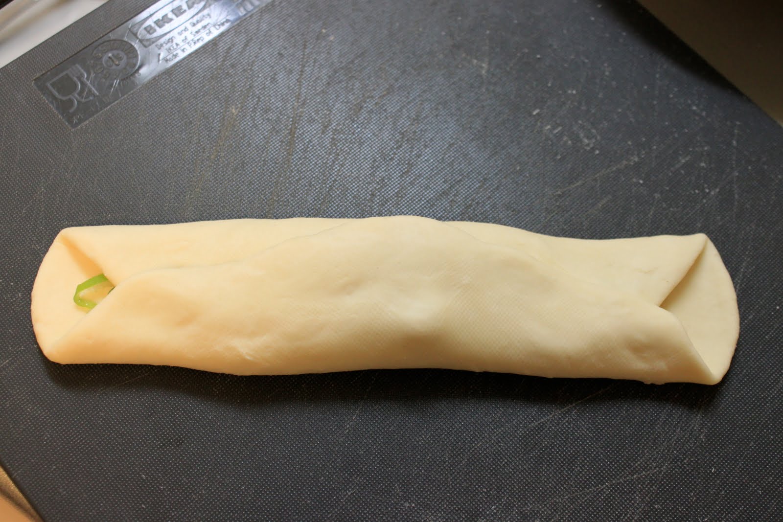 麵團從長條形的兩個長邊折成三折。