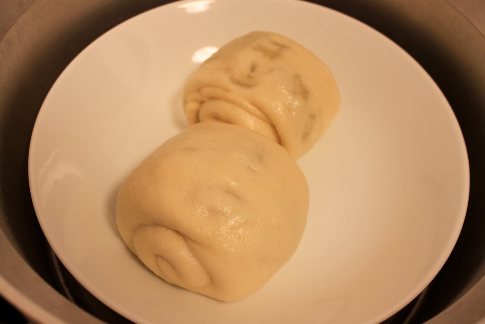 蒸好就變成這樣啦,真的比做包子簡單多了。後來做第二輪時,我還把肉末跟蔥末和在一起抹在麵團上,沒辦法,我家那口子是個肉食動物....