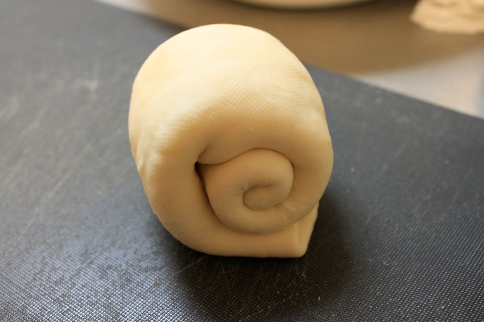 先稍微把麵團壓平(免得內餡不平整),然後再從兩端捲起來,就變成這樣啦,好可愛喔!