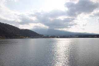 好吧,這照片根本不是我們照的,是從山中湖的網頁下載來的。我們星期六到河口湖後,又花了一千多円日幣兩天之內無限乘坐巴士遊河口湖、西湖。照理說從這五個湖都可以近處眺望富士山,然而天氣雖好,一路上的湖景配上顏色已經變紅的楓葉漂亮的很,不過當巴士經過理應是眺望富士山最佳地點的地方,我們看到的東西是這樣的: