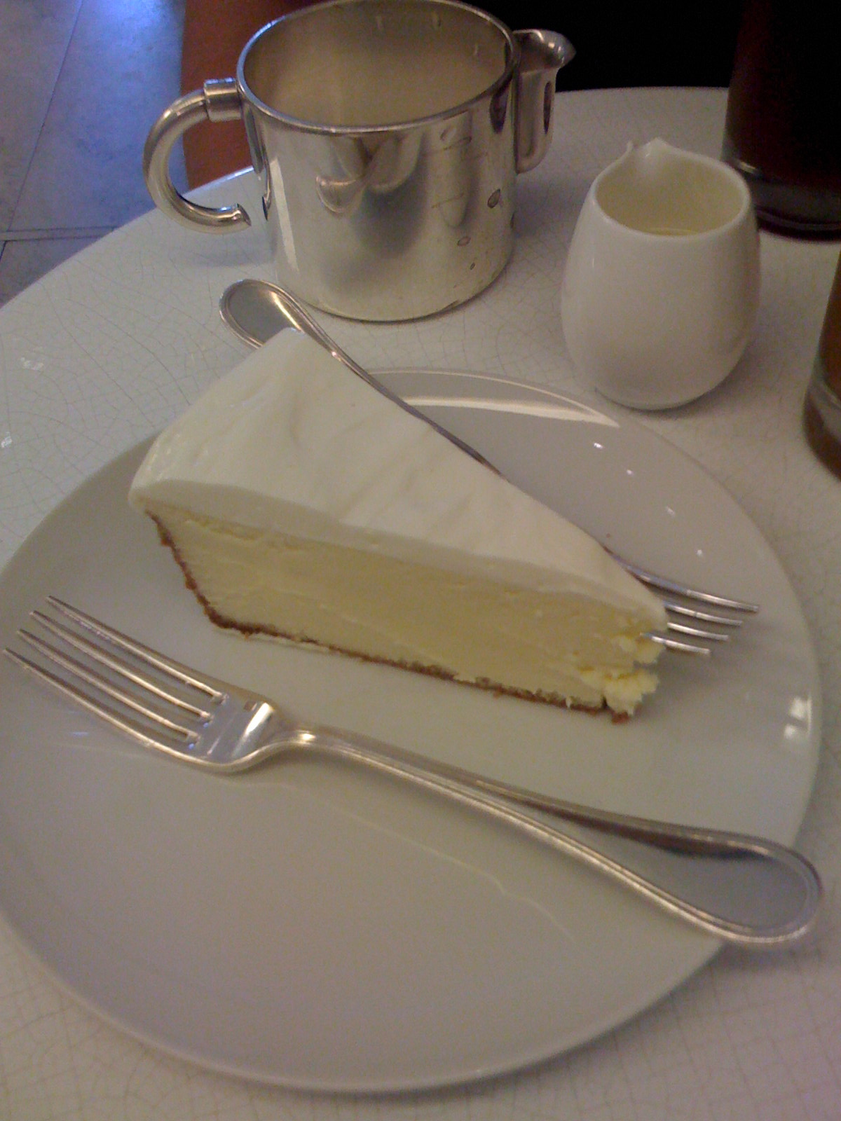 走進Lady M,米色漂亮的counter上擺滿了各種蛋糕。這裡賣的蛋糕可不是一般pastry店時常見到的樣式,我點了Gateau Nuage–這是Lady M特製的cheesecake,上面再加上一層白色的甜sour cream,光是外型就覺得很高貴。味道甜中微微帶酸,說不出的特別滋味。誰會想到cheesecake+sour cream的組合呢?不過價錢也很高貴,一個slice的蛋糕要七、八元。