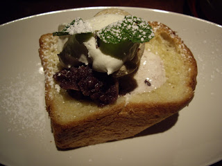 因為不知道該點什麼甜點,很貪心地點了dessert assortment,四樣甜點加上一壺jasmine pearl tea才16元。冰淇淋也是jasmine pearl 的flavor,搭配我點的茶。原本以為它的toast只是一般普通的烤土司塗上奶油,沒想到端上來的土司竟然有五、六片土司疊起來厚,烤過的奶油土司酥酥軟軟,上面淋有抹茶醬及紅豆泥,最後再加上一大坨鮮奶油,這是最豐盛的下午茶盛宴。