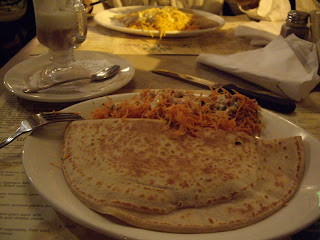 【Monreal的第一晚】晚上9點到達Montreal,check in旅館後,就到Place Jaques Cartier廣場找東西吃。在這家有爵士樂的餐廳點了雞肉crepes(可麗餅),可惜裡面的東西有點鹹。